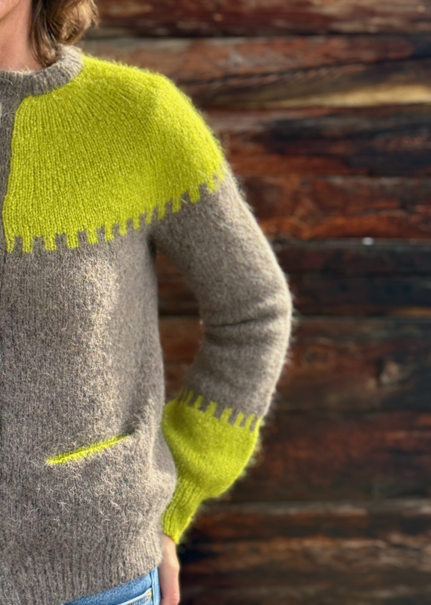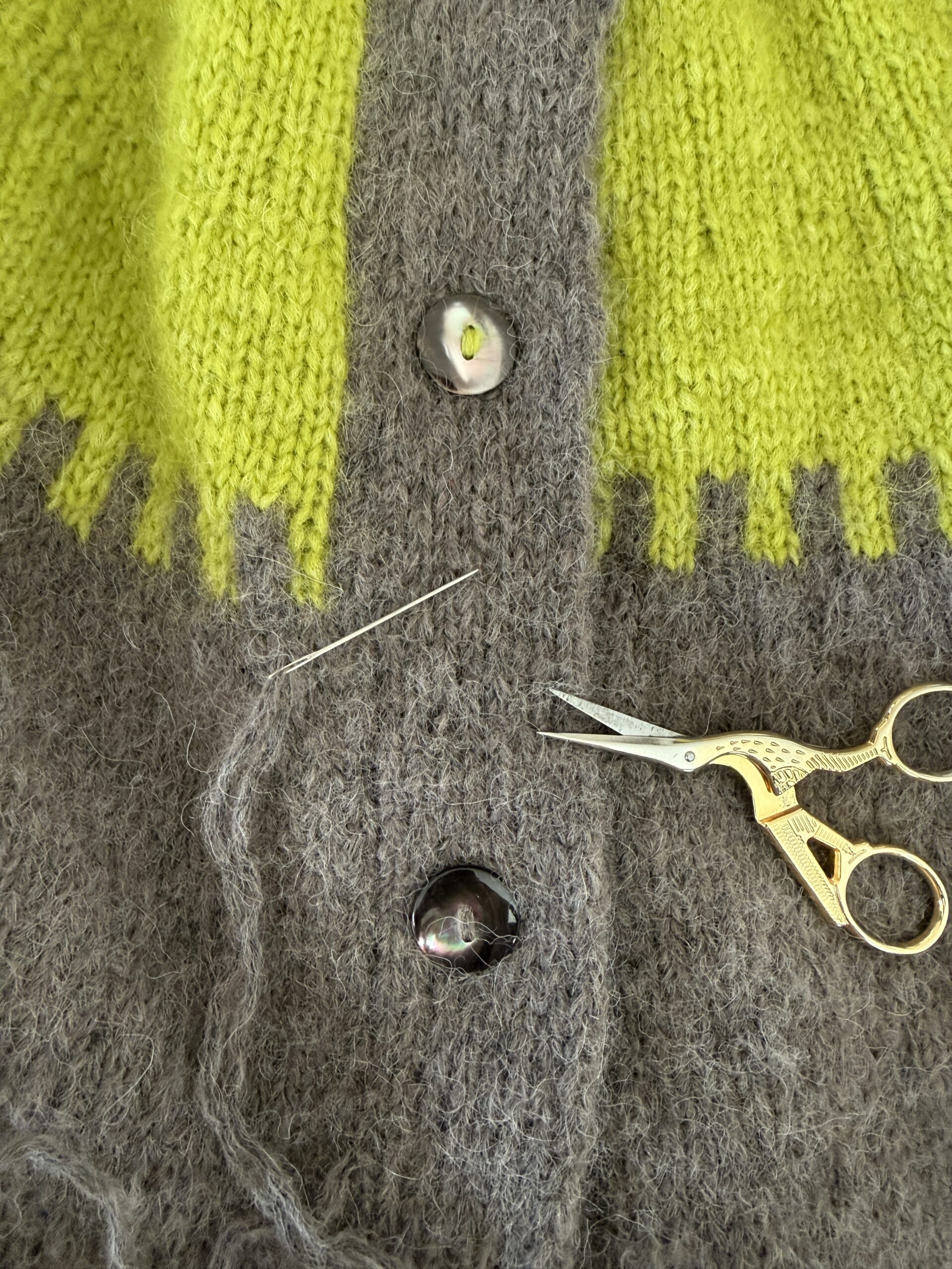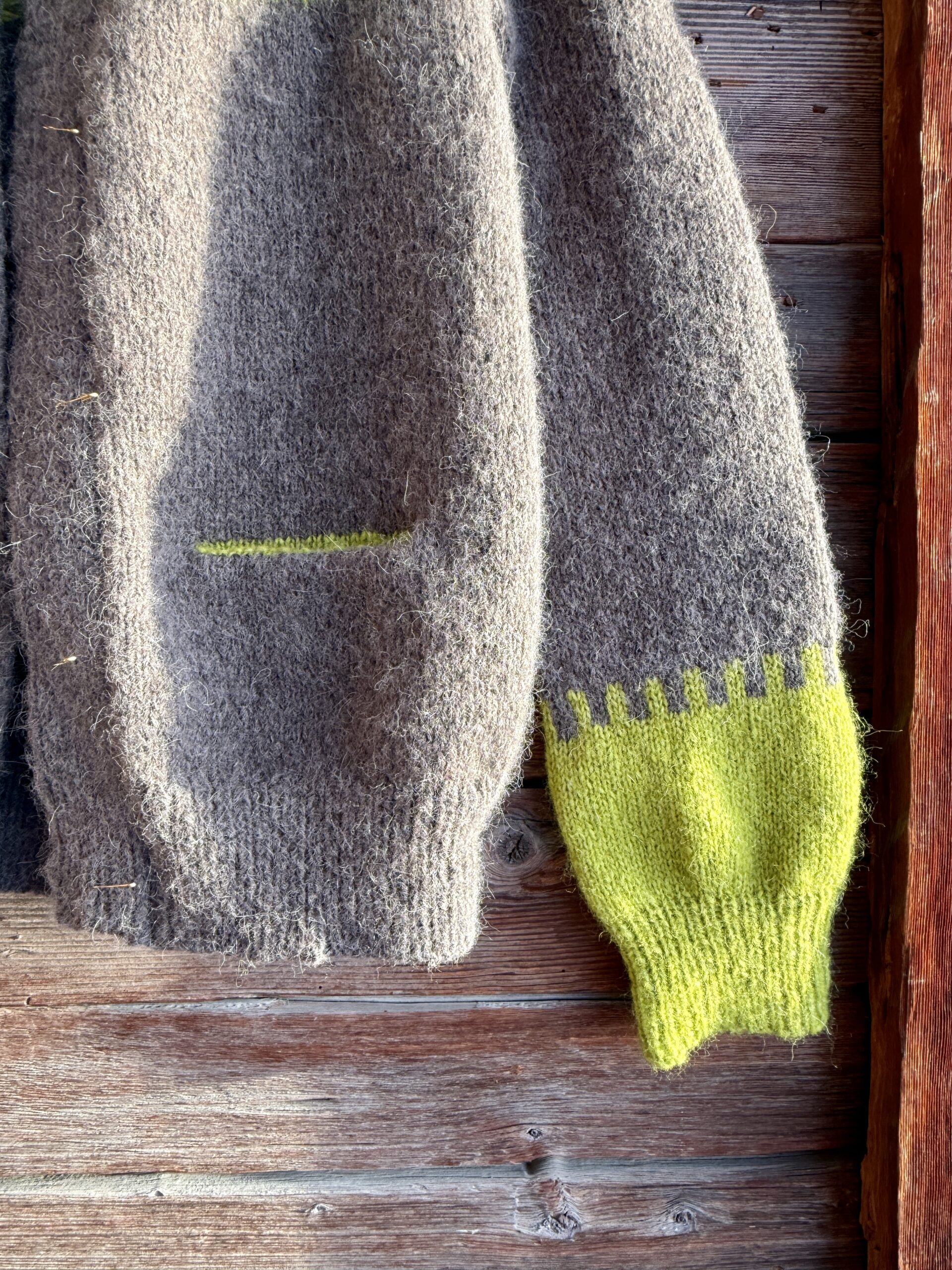 sleeves, while placing the mosaic colorwork pattern. At the end of the yoke, the sleeves are put on hold, and the body is knitted while incorporating the pocket openings. The bottom of the cardigan is finished with rib 1×1 in combination knitting, also used for the cuffs. The button band, wide and structured, is worked in double knitting. The folded collar, in rib 1×1, is knitted after picking up stitches around the neckline. The pockets, then the sleeves, are then resumed and knitted in the round, with or without colorwork pattern. The work is finished by sewing on the buttons.