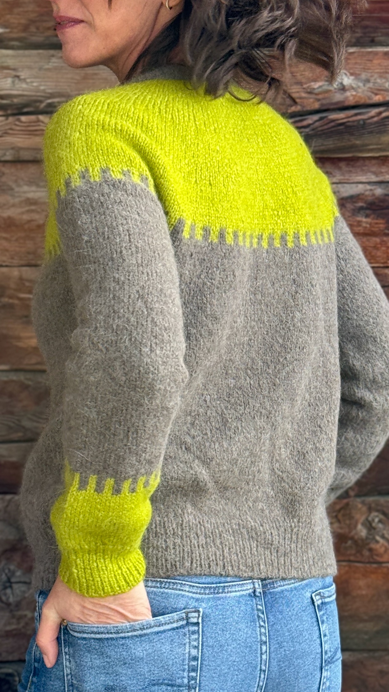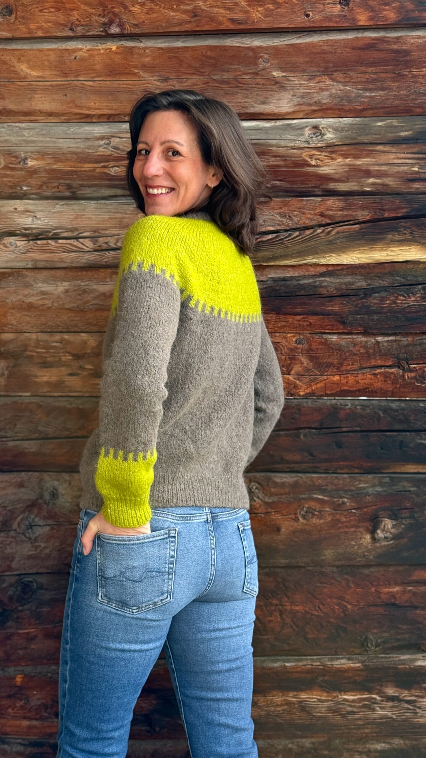 The GIANNA cardigan is knitted from the top down, in one piece and seamless. After a few short rows to shape the neckline, the yoke is worked using yoke-style increases, gradually forming the upper body and