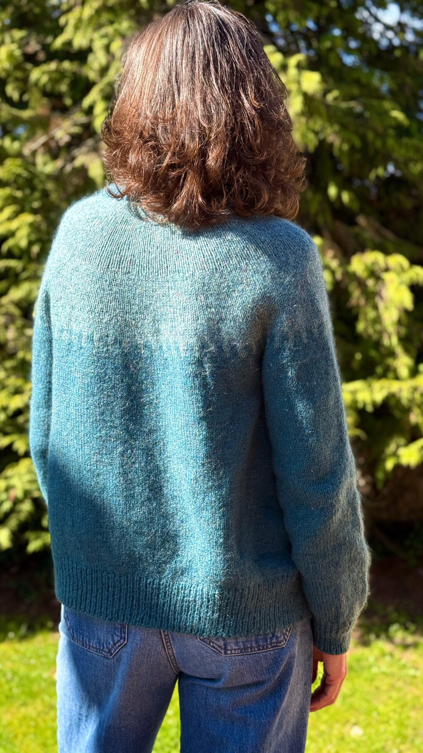 The blue prototype was realised with one strand of Loch Lomond by BC Garn (col. O2 and 10) held together one strand of with Le Petit Mohair & Silk by Biches & Buches (col. Blue green).