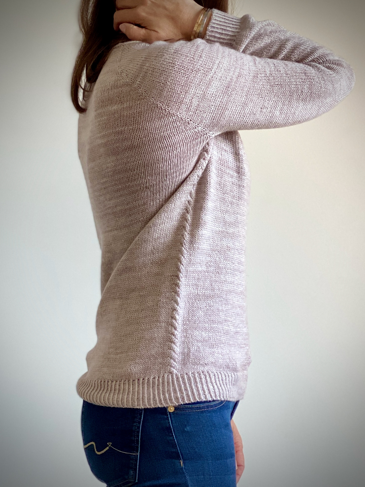 In this seamless raglan design, Lili is knit from the top-down, in-the-round and entirely in stockinette stitch. An i-cord edge finishes the V-neck and a simple cable underlines the sides of the garment. The hem and wrists are knit in twisted 1/1 ribs.